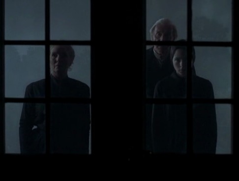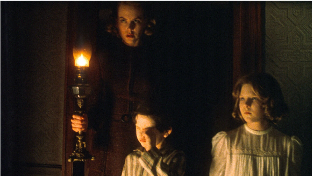 아무도 커튼을 치지 않았건만 커튼이 모두 열려있질 않나, 피아노를 연주하는 소리가 들리고 아무도 없는 윗층에서 쿵쾅대는 소리가 들립니다. 처음에는 앤이 동생 스튜어트에게 장난을 치기 위해 꾸며낸 이야기라고 생각했지만 그레이스 자신도 앤이 말하던 할머니 형상을 보게 됩니다. 그레이스는 귀신이 아닌 침입자가 들어왔다고 생각해 총을 꺼내 가족들을 지키려 합니다.